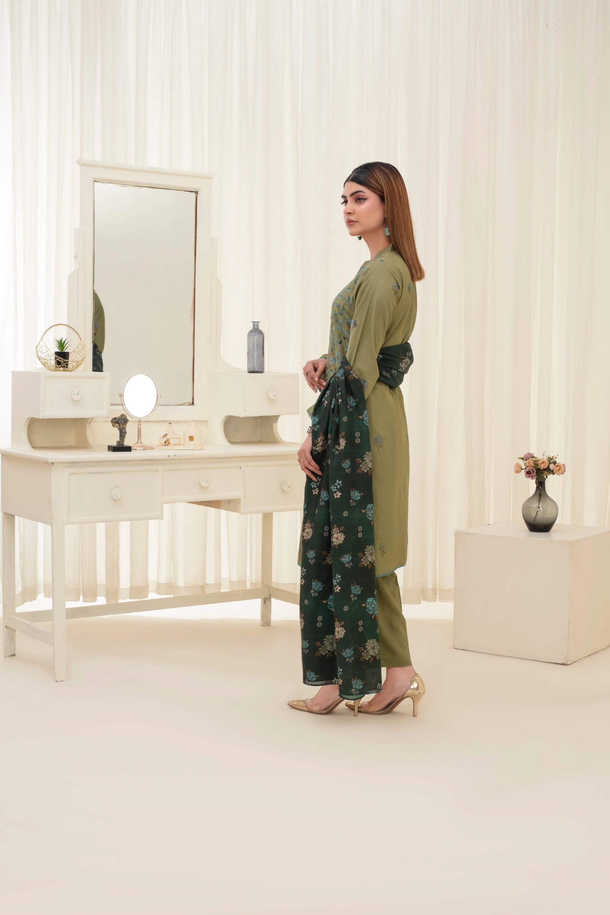 Complementing the suit is the matching embroidered dupatta, adorned with delicate patterns that elevate the overall look. Its elegant drape and lightweight feel add a touch of femininity and refinement, creating a balanced and graceful silhouette.