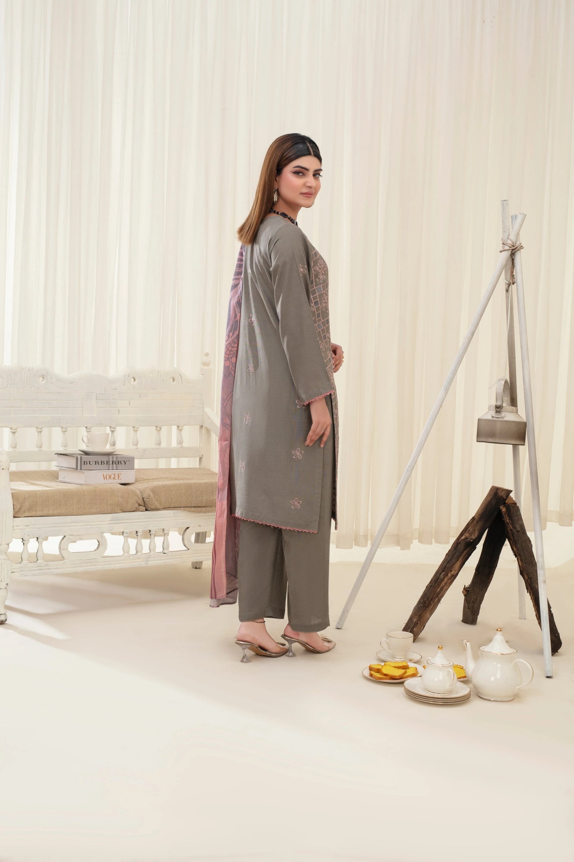 Paired with a luxuriously soft dupata, this ensemble enhances the overall look while providing warmth and elegance. The shawl drapes effortlessly, adding a refined finish to the outfit.